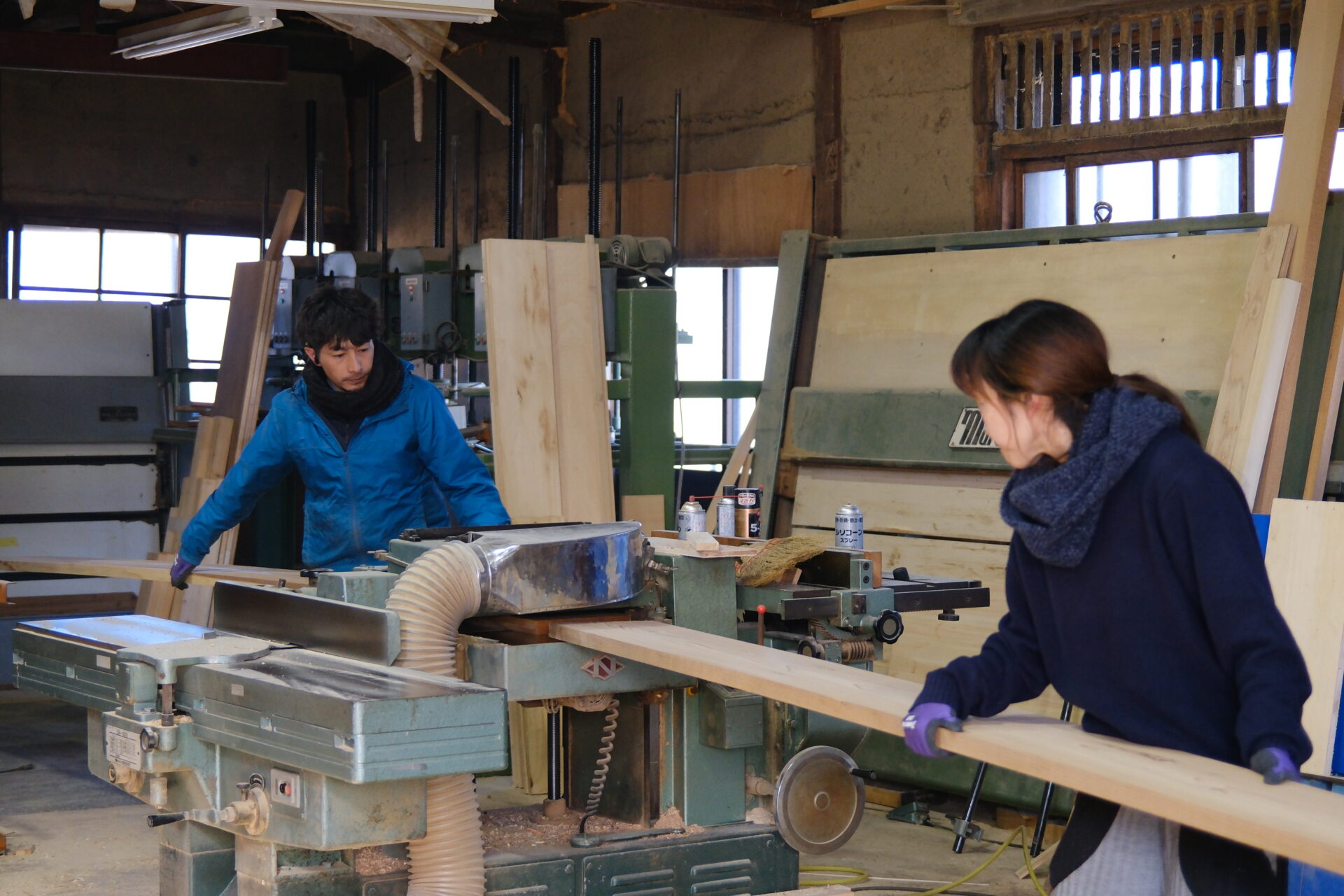 加工場を覗きに行くと、他の大工が現場に出払っているため、事務社員が加工のサポートに入っていました。
