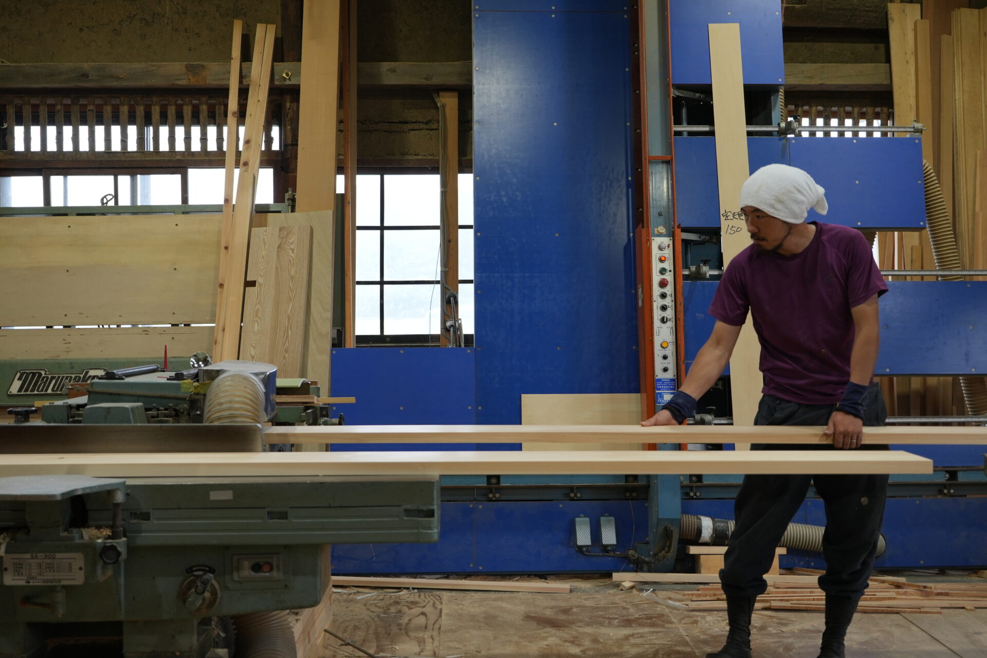 無垢材だからこそ、季節によって反りがでる材木をこの機械で調整し、美しく仕上げています。