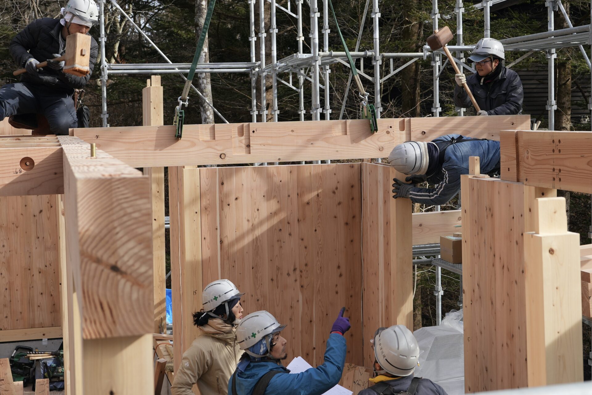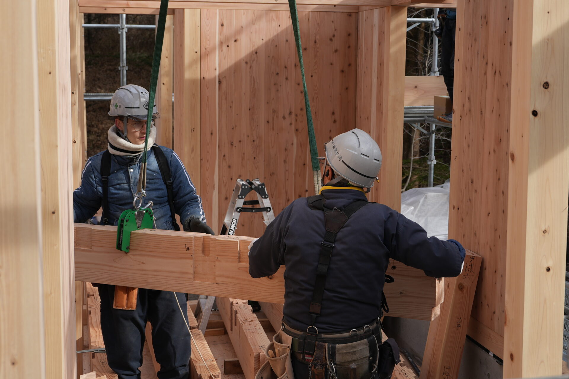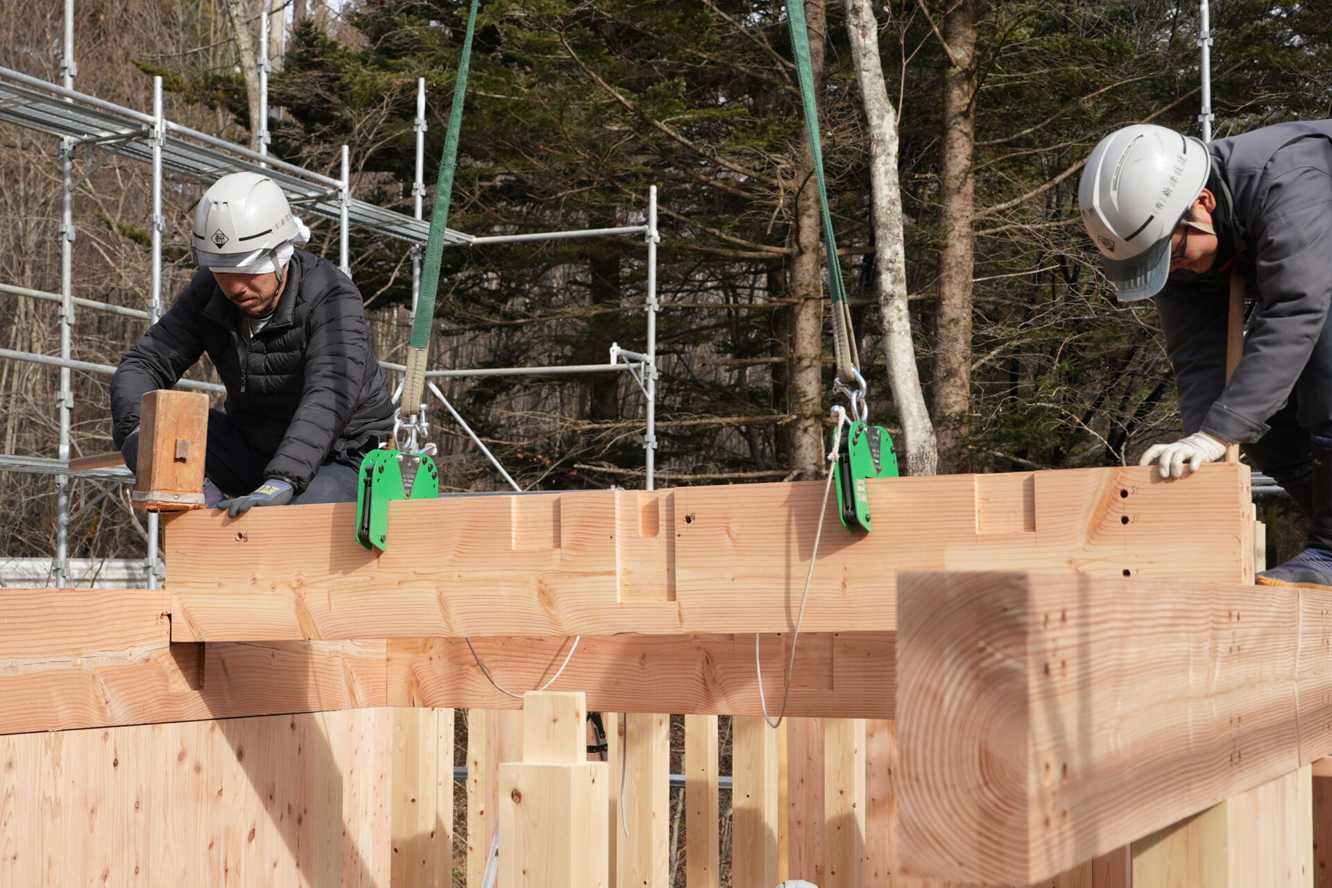 今回は、お客様のご要望(直交集成板)でCLTを採用しています。クレーンで構造材を所定の位置に運び、掛矢(かけや)と呼ばれる木槌で締めながら、精度を確かめつつ組み上げていきます。大工同士が声を掛け合いながら慎重に作業を進める姿は頼もしく、現場には心地よい緊張感が漂っていました。