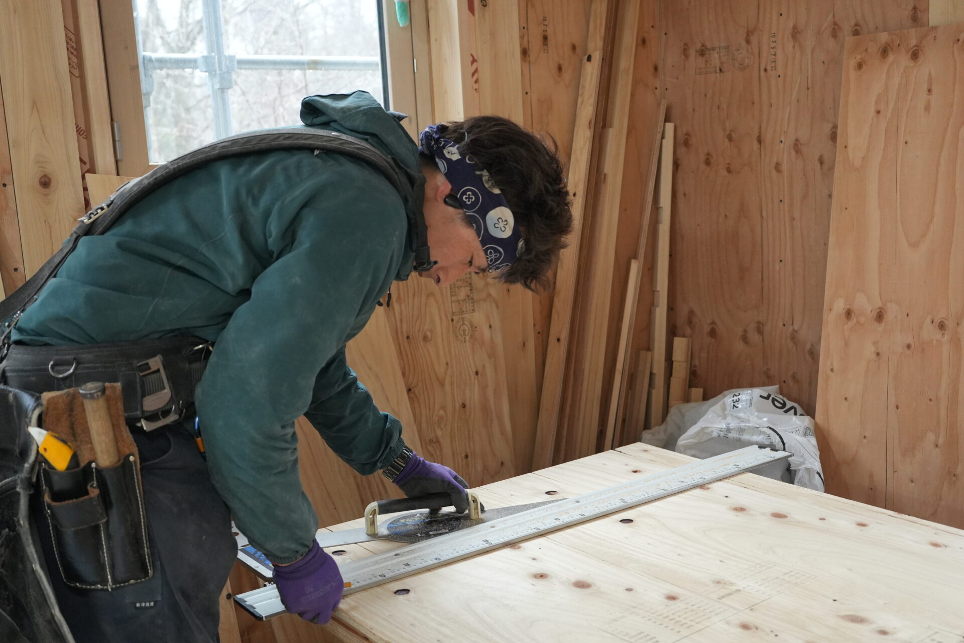 もくもくと床板の下地材を張り進めていく棟梁。しとしとと降る雨に耳を傾けながら、心地よい時間が流れていました。